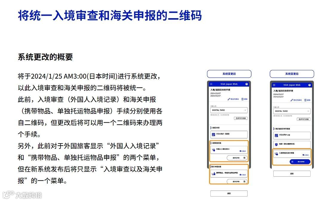 1、来自日本数字厅的通知,将于2024/1/25 AM3:00(日本时间)进行系统更改,以此入境审查和海关申报的二维码将被统一。此前,入境审查(外国人入境记录)和海关申报(携带物品、单独托运物品申报)手续分别使用各自二维码,但更改后将可以用一个二维码来办理两个手续。