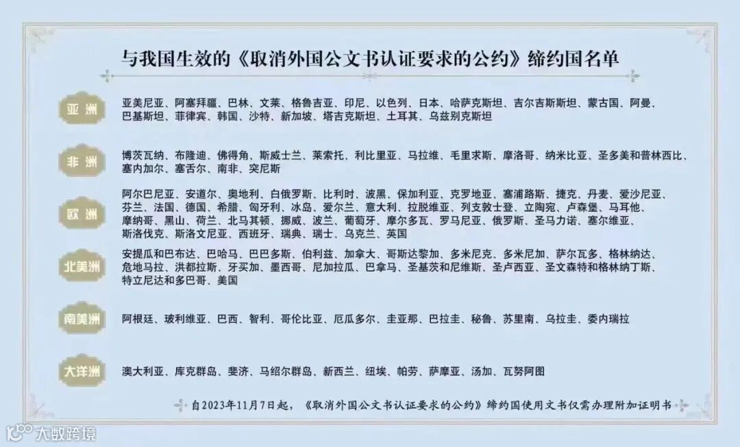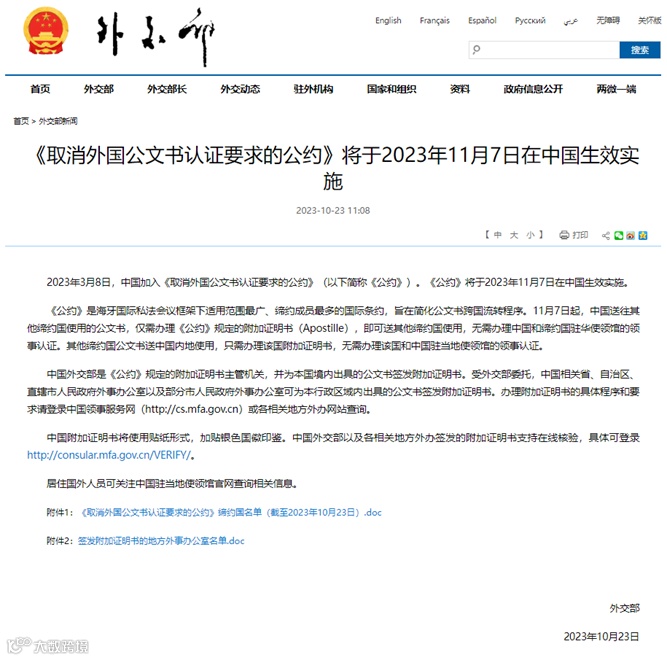 2023年11月7日,《海牙认证公约》在中国生效实施。