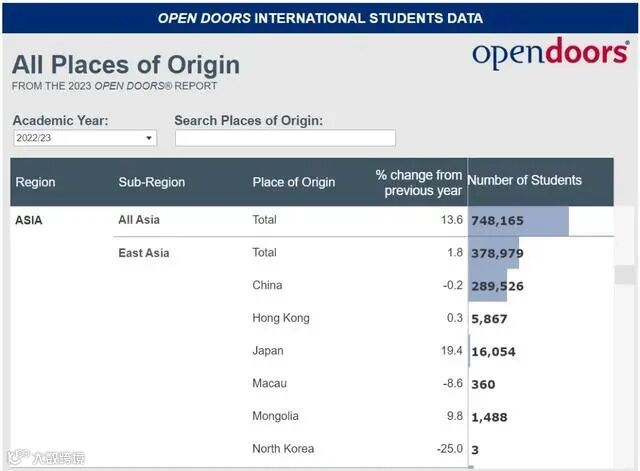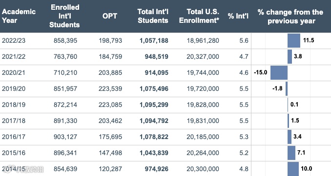 数据显示,在2022/23学年美国的国际生人数为1,057,188人,和去年相比,国际学生人数增加了11.5%,再次突破100万人,超过了疫情前的2019/2020年水平。