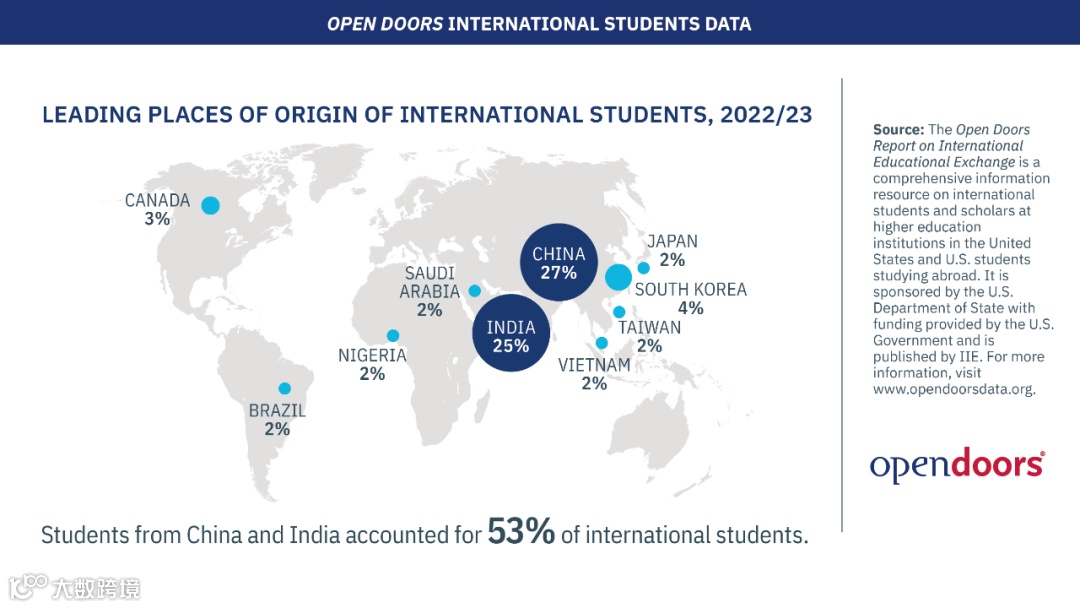 根据《美国开放门户报告》数据显示,2022至2023学年美国在读国际学生人数再次突破100万人,同比2022年增加11.5%;中国大陆学生仍然是美国国际学生的最大群体,为289,526人,占美国所有国际留学生人数的27.4%。