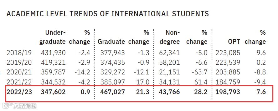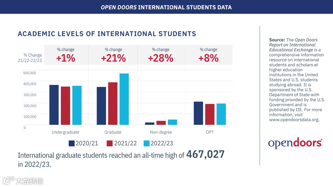 研究生数量今年增长继续遥遥领先,2022/23学年有467,027名国际学生在美读研,比上一学年增长21.3%,去年的增幅为17%,可以看到疫情结束后,大家赴美读书的需求越来越旺盛。