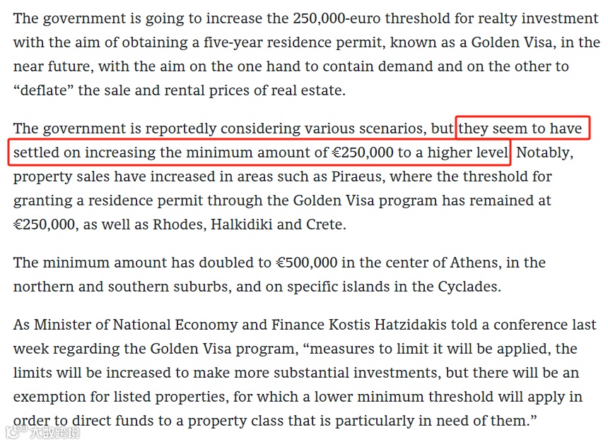 简单来说就是,希腊政府正在考虑各种方案,可能将部分区域的投资门槛从目前的25万欧元提高到更高的水平,而部分市中心老旧房产或旅游地产翻新项目将保持现有政策。