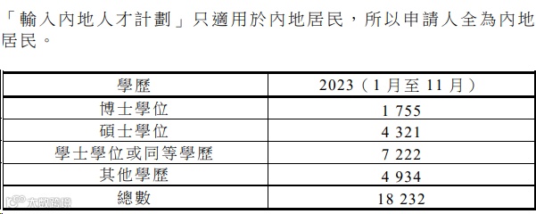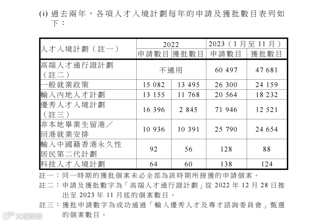 输入内地人才计划即专才计划,此计划仅面向内地居民,共收到了20,564宗申请,其中18,232宗已获批,10,928位专才已来港。与2022年相比,此计划获批人数增加了将近7万,成绩亮眼。