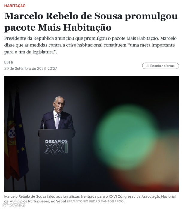 10月1日, 葡萄牙总统马塞洛·雷贝洛·苏萨已签署了“更多住房”(Mais Habitação)法案,他表示“宁可有点,也不要什么都没有”。他在进入葡萄牙市政协会全国大会的时候宣布了这一决定,强调议会已经确认通过,他在法定的八天期限之前已经签署了“更多住房”法案。该法案将提交给议会和政府签字,然后最终公布,法案将在4到8天内生效。该法案规定,将房屋出售给政府的房地产所有者免征资本利得税,不再发放新的黄金签证。