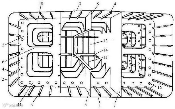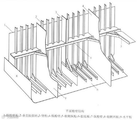 4一内壳板;5一舷侧纵骨;6一内壳板纵骨;