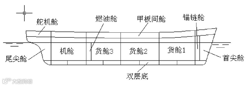 主船体由甲板和外板组成一个水密外壳,内部被甲板、纵横舱壁及其骨架分隔成许多舱室。