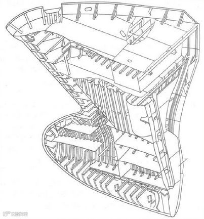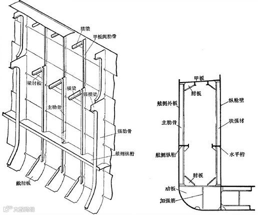 横向有环形的肋骨框架可增强船体的横向强度和刚性。