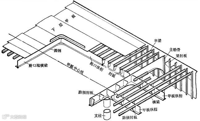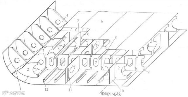 强力甲板和船底一般采用纵骨架式结构,底部为双层底结构。