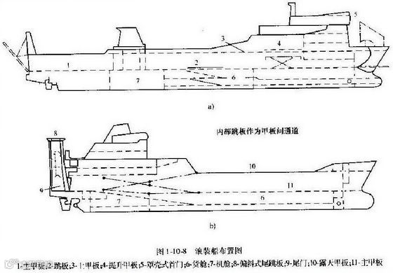 滚装船结构布置特点是首尾设有尖舱,机舱位于尾部靠近两舫处,高度很低,近似于封闭式。