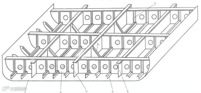 为保证总纵强度和加强甲板及外板的刚性,所有板架上都装置密集的纵骨。