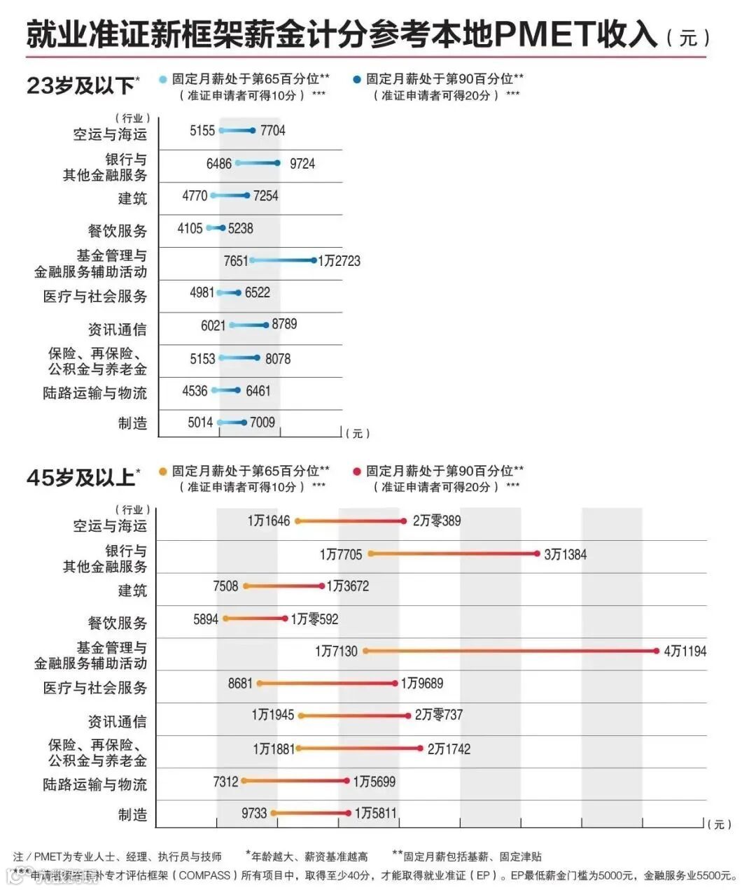 近期,新加坡人力部在参考部门研究与统计处的年度综合劳动力调查数据并调整后,首次在网站列出22个行业及年龄23岁至45岁本地专业人士、经理、执行员与技师(PMET),在同行排第65百分位及第90百分位的收入数据,供雇主参考。外籍雇员在EP新计分制下,薪水须向本地前三分之一PMET收入看齐,才能在薪水项目取得10分。超过90%的月薪则能取得20分。