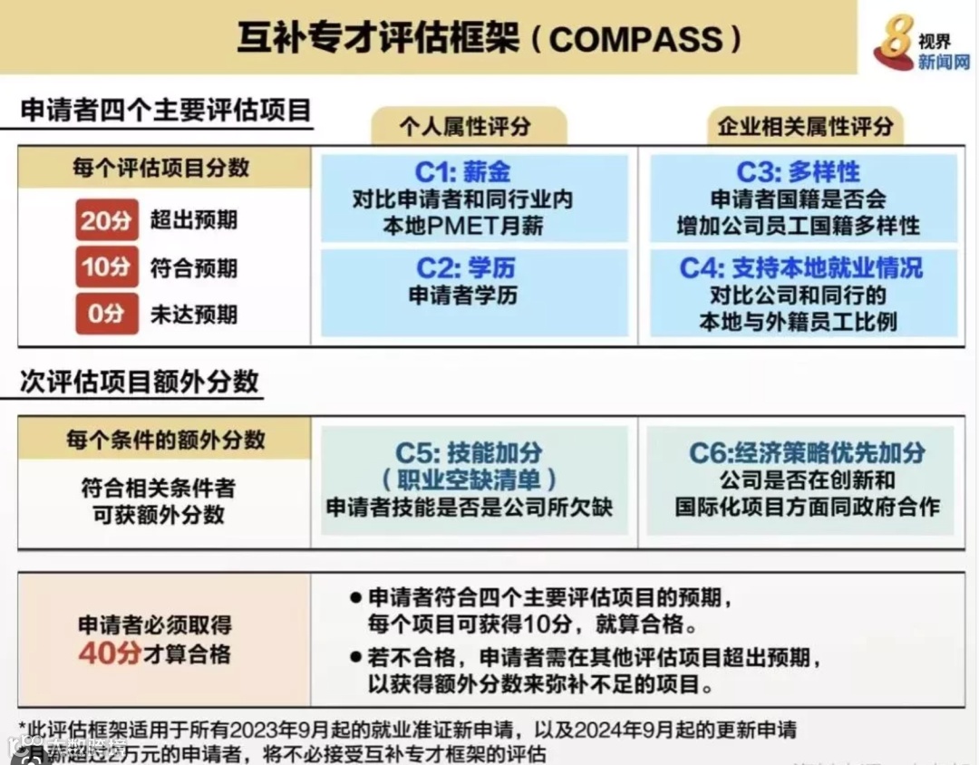 2023年9月1日起,新加坡再度提高准证门槛,针对新的EP申请人将采取最新计分制互补专才评估框架(简称COMPASS),EP续签将于2024年9月1日开始执行。