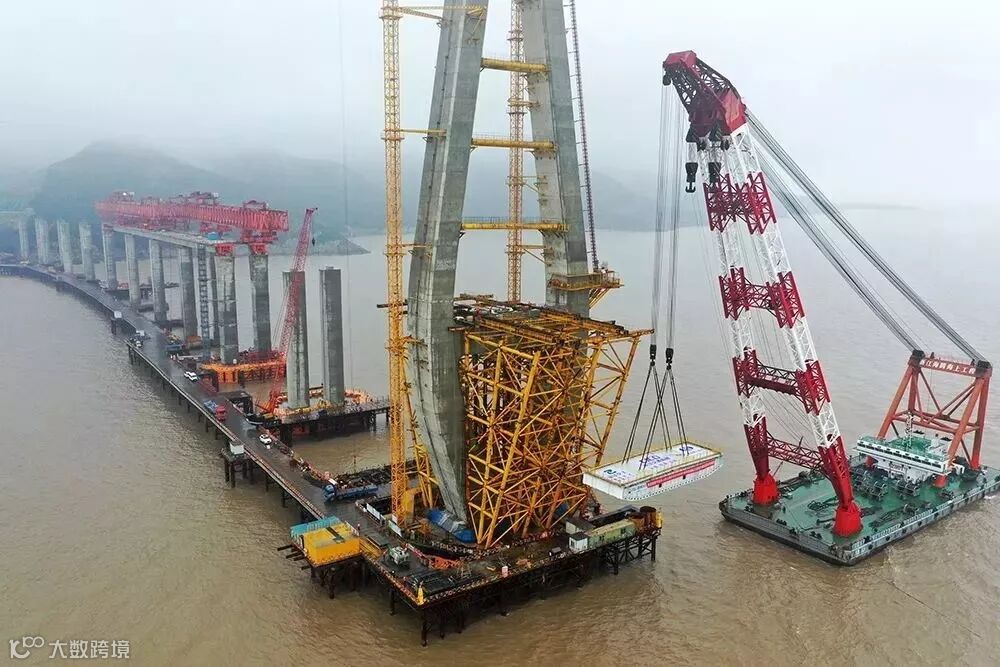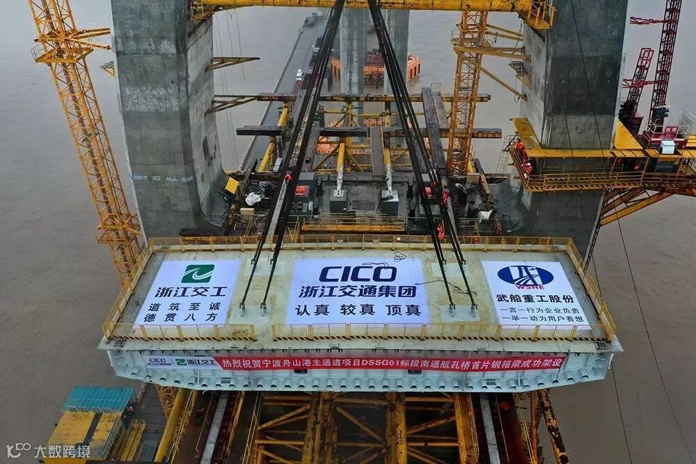 近日,宁波舟山主通道舟岱大桥南通航孔桥首片钢箱梁完成架设,标志着该桥主塔上部结构施工正式开始。首片吊装的钢箱梁节段长9.53米、宽27.32米、高3.5米、重236.1吨。