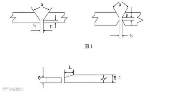 3.工件厚度大于6 mm对接焊时,为确保焊透强度,在板材的对接边沿开切V形或X形坡口,坡口角度α为60°,钝边p=0~1 mm ,装配间隙b=0~1 mm,如图1。当板厚差≥4 mm时,应对较厚板材的对接边缘进行削斜处理,如图2。
