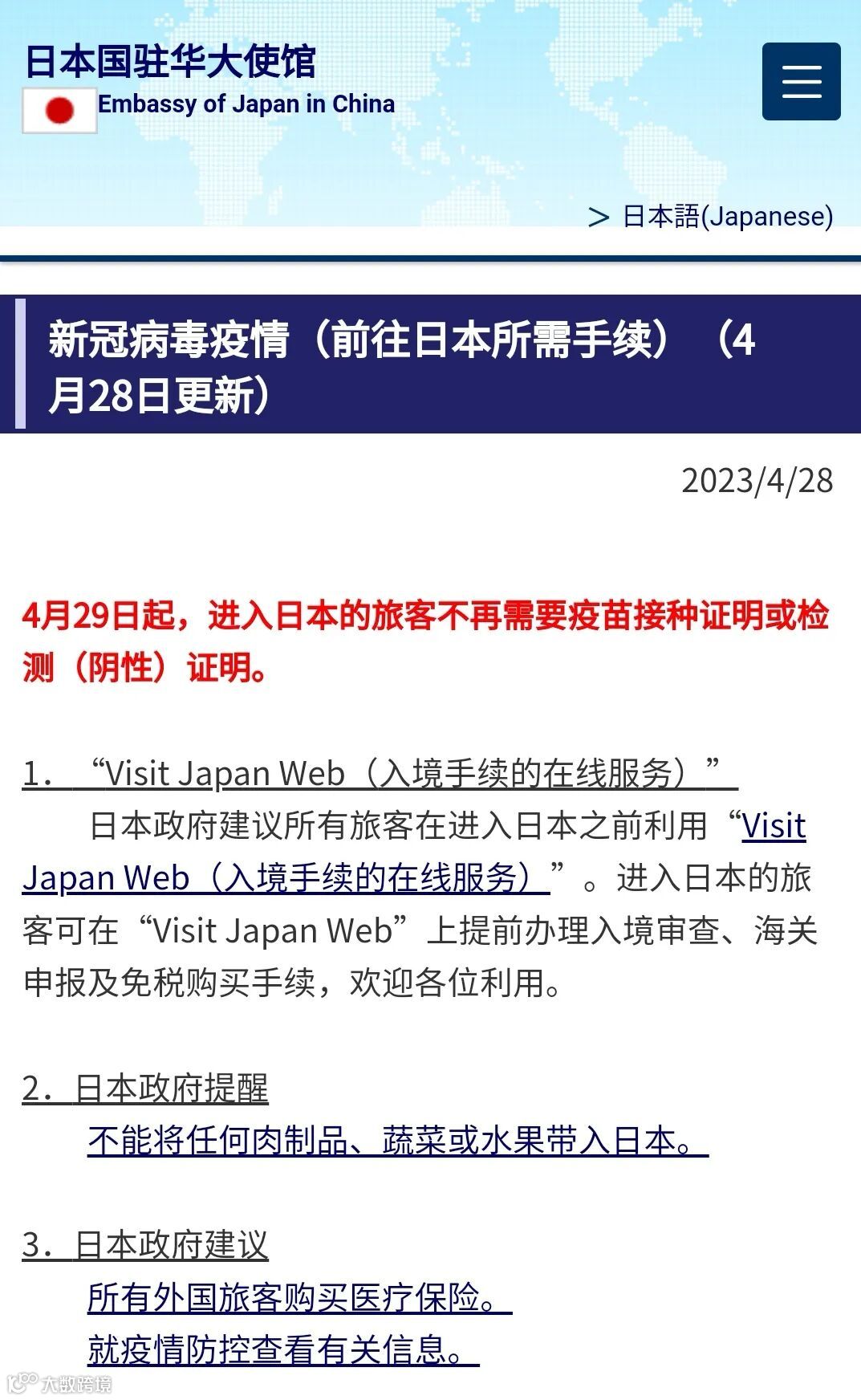 根据日本政府的最新发表,从4月29日凌晨零点起包括中国游客在内的所有入境日本的人员,都不再需要提供三针新冠接种证明或入境日本之前72小时内的核酸证明,另外此前针对中国飞来航班所进行的20%的抽查检测也将全面取消!