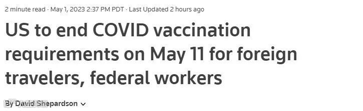 美国白宫宣布将在5月11日结束新冠公共卫生的紧急状态,包括终止国际旅客入境新冠疫苗要求!