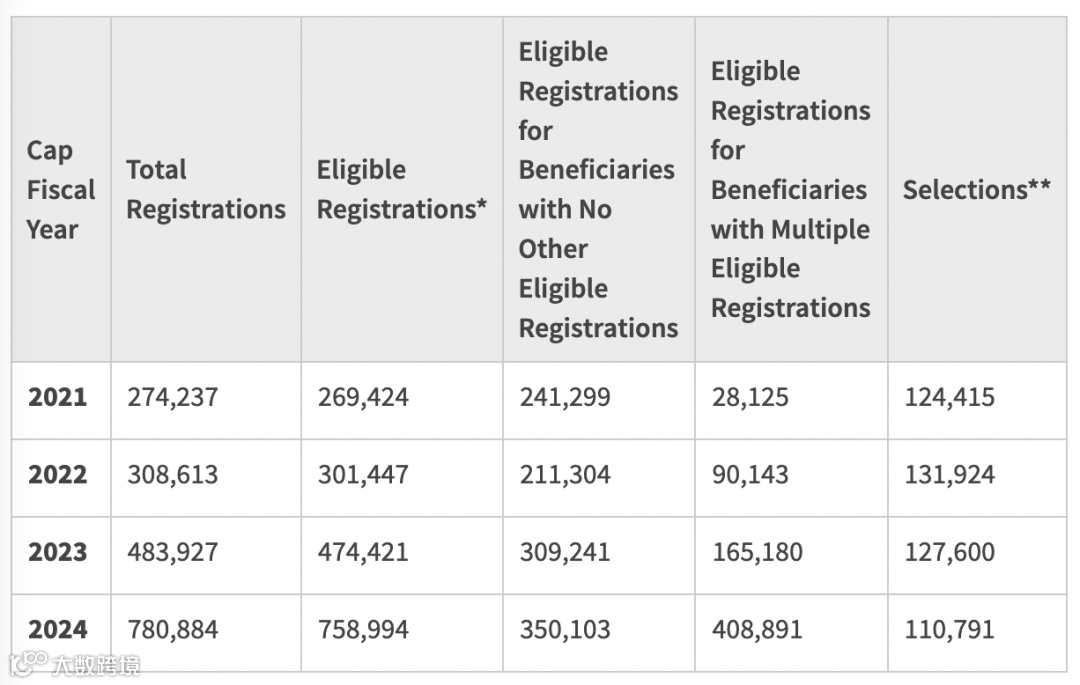 美国移民局公布了2024财年、即2023年3月刚刚进行的这一轮抽签类H-1B的申请数据:共有780,884份H-1B网上注册,有效注册为758,994份,移民局共抽取了110,791份有效注册,粗略中签率为14.2%,有效中签率为14.6%,创造了自从有H-1B抽签程序以来的史低纪录,另外仅有一份注册的注册人数为350,103,多份注册为408,891份。