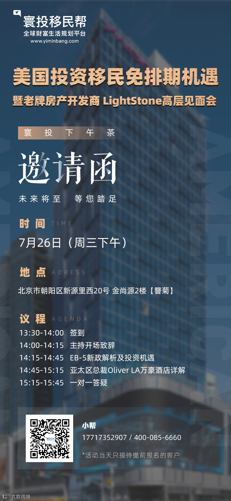 7月26日(周三)13:30,移民帮将在北京举办EB-5免排期项目分享会,本次活动将会有老牌房产开发商盛石集团的高层出席演讲。感兴趣的小伙伴赶紧扫码报名吧!