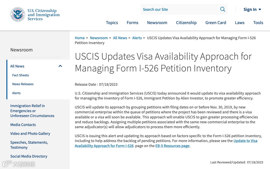 就在7月18日,美国移民局(USCIS)发布公告,宣布将更新EB-5投资移民的申请审理方法,即:EB-5申请表I-526(外国投资者移民申请表)的审批流程。
