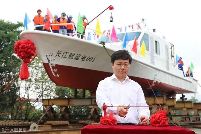 长江航务管理局副局长魏志刚,长江航道局副局长王建斌,中车永济电机有限公司副总经理郭永安,西安中车永电电气有限公司总经理王庆军,中国船级社武汉分社建造处处长叶宁,武昌船舶重工集团有限公司副总经理王渭龄为“长江航道电001”下水剪彩。郭永安行“掷瓶礼”。