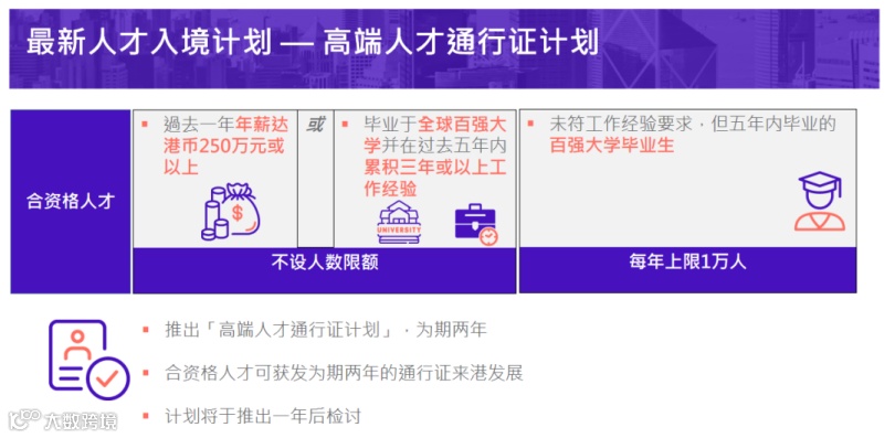 ①过去一年年薪达到港币250万元以上的人才,不论学历可申请;或②毕业于全球百强大学并在过去5年累积3年或以上工作经验。