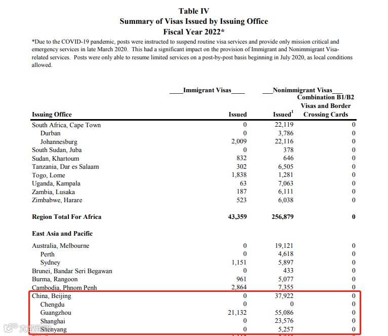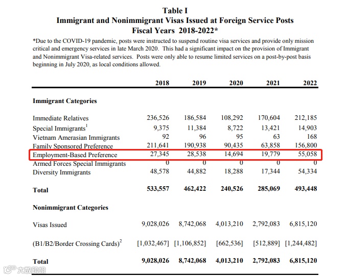 美国国务院公布了2018-2022财年全球签发的移民签证和非移民签证数据。