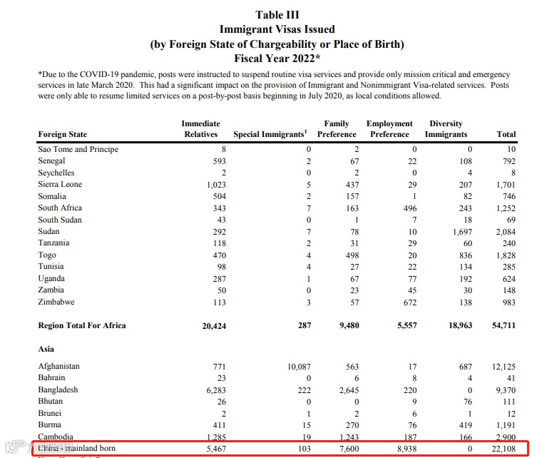 2022财年,中国大陆出生的申请人共获得约2.2万张移民签证,按分类如下: