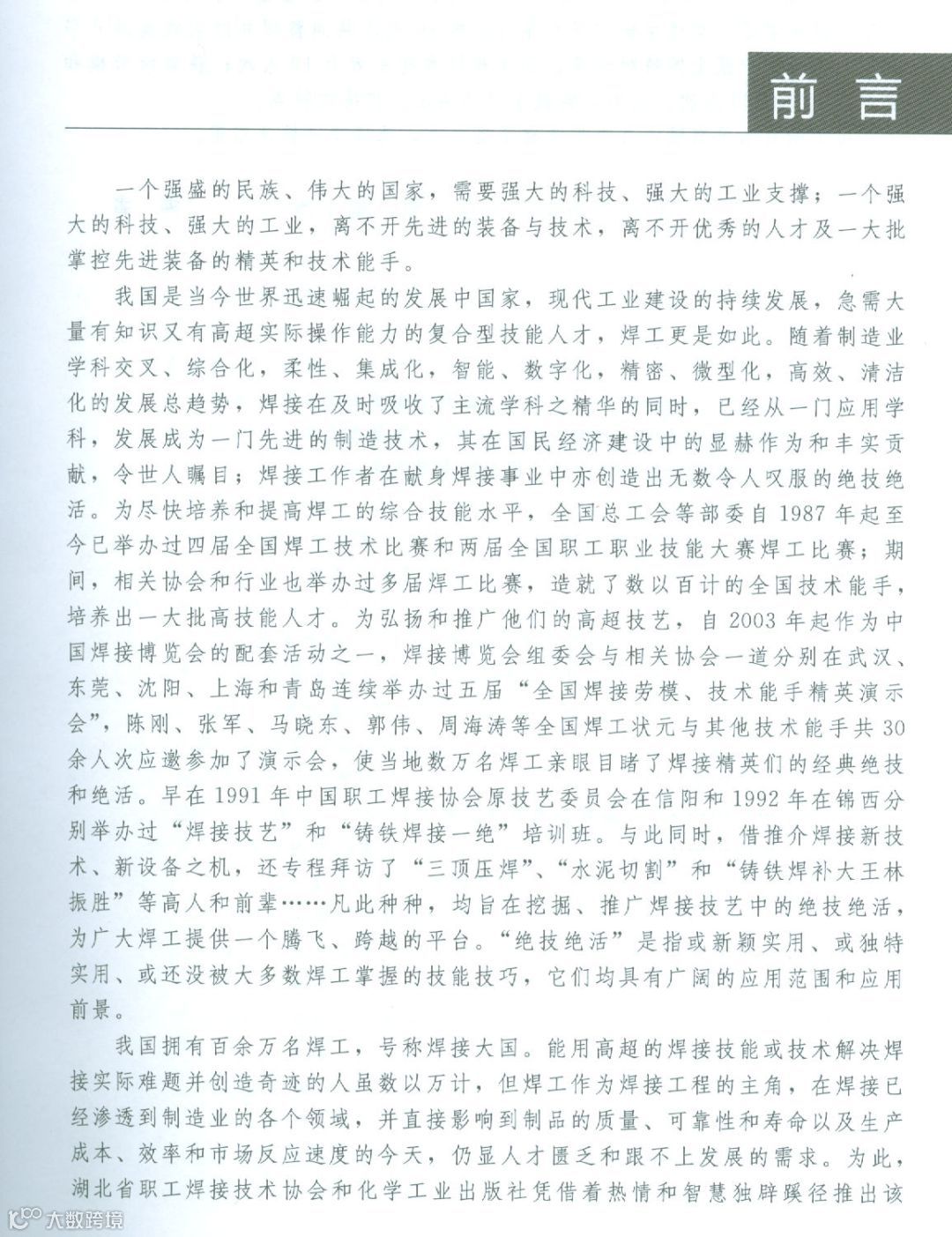 我国是当今世界迅速据起的发展中国家,现代工业建设的持续发展,急需大量有知识又有高超实际操作能力的复合型技能人才,焊工更是如此。随着制造业学科交叉、综合化,柔性、集成化,智能、数字化,精密、微型化,高效、清洁化的发展总趋势,焊接在及时吸收了主流学科之精华的同时,已经从一门应用学科,发展成为一门先进的制造技术,其在国民经济建设中的显赫作为和丰实贡献,令世人瞩目;焊接工作者在献身焊接事业中亦创造出无数令人叹服的绝技绝活。为尽快培养和提高焊工的综合技能水平,全国总工会等部委自1987年起至今已举办过四届全国焊工技术比赛和两届全国职工职业技能大赛焊工比赛;期间,相关协会和行业也举办过多届焊工比赛,造就了数以百计的全国技术能手,培养出一大批高技能人才。为弘扬和推广他们的高超技艺,自2003年起作为中国焊接博览会的配套活动之一,焊接博览会组委会与相关协会一道分别在武汉、东莞、沈阳、上海和青岛连续举办过五届“全国焊接劳模、技术能手精英演示会”,陈刚、张军、马晓东、郭伟、周海涛等全国焊工状元与其他技术能手共30余人次应邀参加了演示会,使当地数万名焊工亲眼目睹了焊接精英们的经典绝技和绝活。早在1991年中国职工焊接协会原技艺委员会在信阳和1992年在锦西分别举办过“焊接技艺”和“铸铁焊接一绝”培训班。与此同时,借推介焊接新技术、新设备之机,还专程拜访了“三顶压焊”、“水泥切割”和“铸铁焊补大王林振胜”等高人和前辈……凡此种种,均旨在挖掘、推广焊接技艺中的绝技绝活,为广大焊工提供一个腾飞、跨越的平台。“绝技绝活”是指或新颖实用、或独特实用、或还没被大多数焊工掌握的技能技巧,它们均具有广阔的应用范围和应用前景。