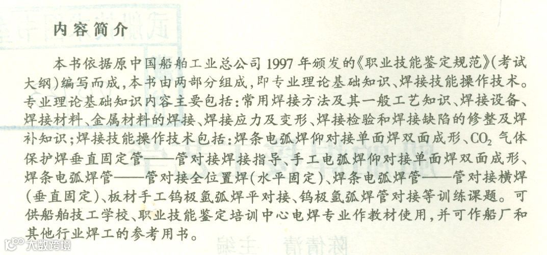 本书依据原中国船舶工业总公司1997年颁发的《职业技能鉴定规范》(考试大纲)编写而成,本书由两部分组成,即专业理论基础知识、焊接技能操作技术。专业理论基础知识内容主要包括:常用焊接方法及其一般工艺知识、焊接设备、焊接材料、金属材料的焊接、焊接应力及变形、焊接检验和焊接缺陷的修整及焊补知识;焊接技能操作技术包括:焊条电弧焊仰对接单面焊双面成形、二氧化碳气体保护焊垂直固定管-管对接焊接指导、手工电弧焊仰对接单面焊双面成形、焊条电弧焊管-管对接全位置焊(水平固定)、焊条电弧焊管-管对接横焊(垂直固定)、板材手工钨极氩弧焊平对接、 钨极氩弧焊管对接等训练课题。可供船舶技工学校、职业技能鉴定培训中心电焊专业作教材使用,并可作船厂和其他行业焊工的参考用书。