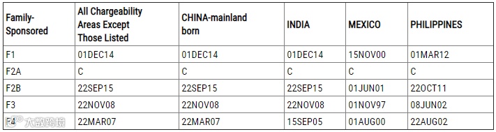 2022年12月亲属移民排期表A中,所有排期均较上月无变化: