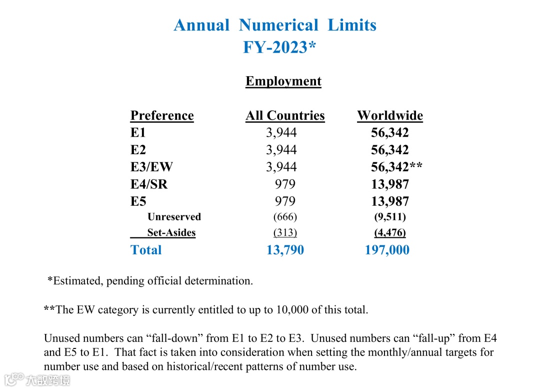 2023财年移民配额中,职业移民配额19.7万张,比正常年份的14万配额多出5.7万张,亲属移民22.6万张。