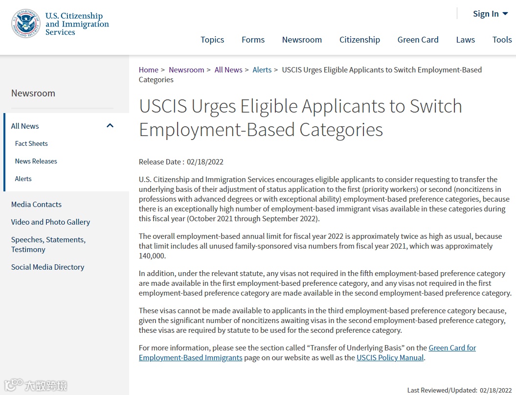 2月18日,美国移民局发文,“鼓励符合条件的申请人考虑将其移民申请转移到第一类(EB-1)或第二类(EB-2)职业类移民”。