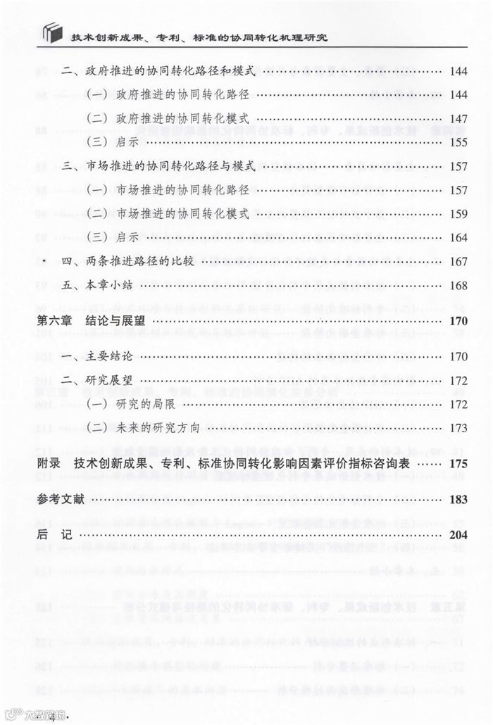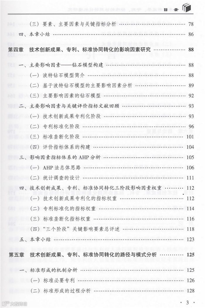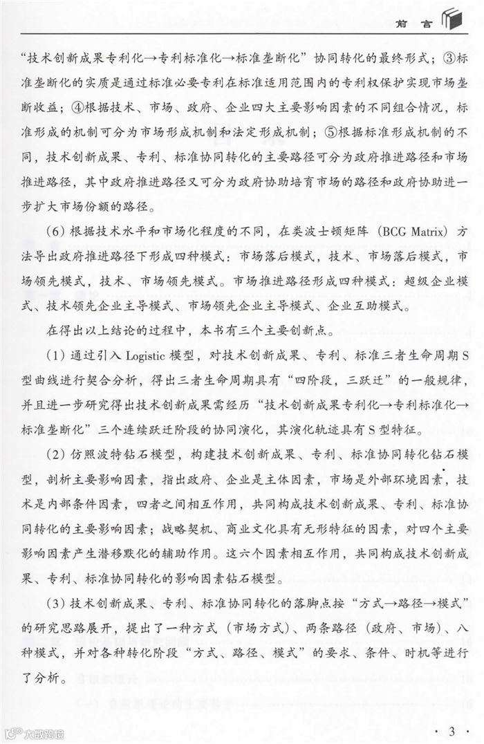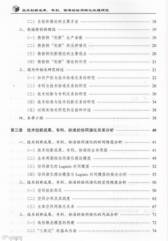 本书一共6章节,第1章绪论;第2章理论基础与研究回顾;第3章技术创新成果、专利,标准的协同演化关系分析;第4章技术创新成果、专利、标准协同转化的影响因素研究;第5章技术创新成果、专利、协同转化的路径与模式分析;第6章结论与展望。