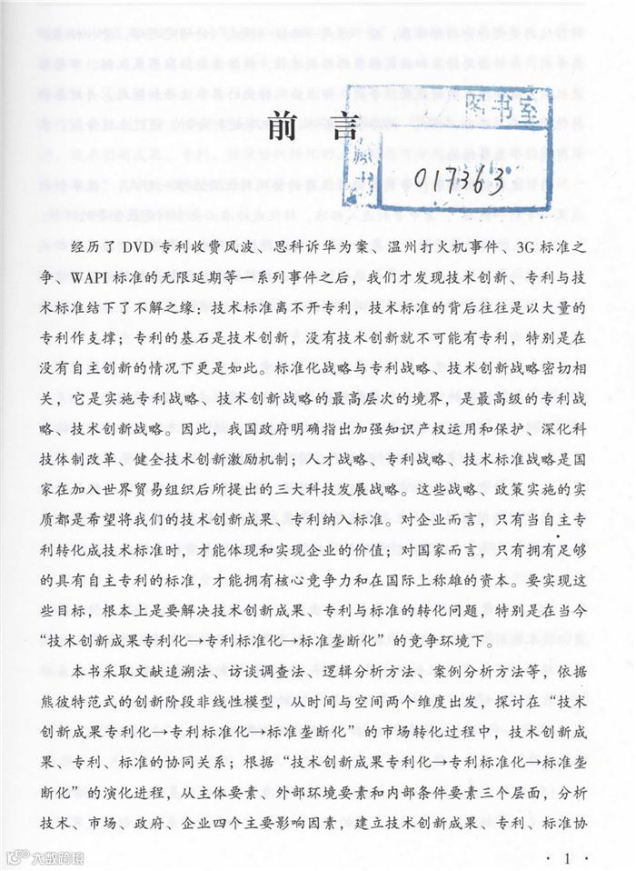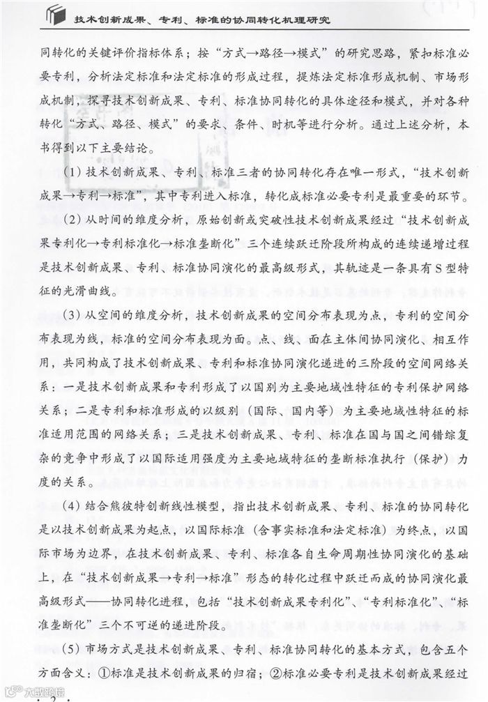 本书采取文献追溯法、访谈调查法、逻辑分析方法、案列分析方法等,从时间与空间两个维度出发,探讨在“技术创新新成果专利化到专利标准化到标准垄断化的市场转化过程中,技术创新成果、专利、标准的协同关系。此书可作为参考。