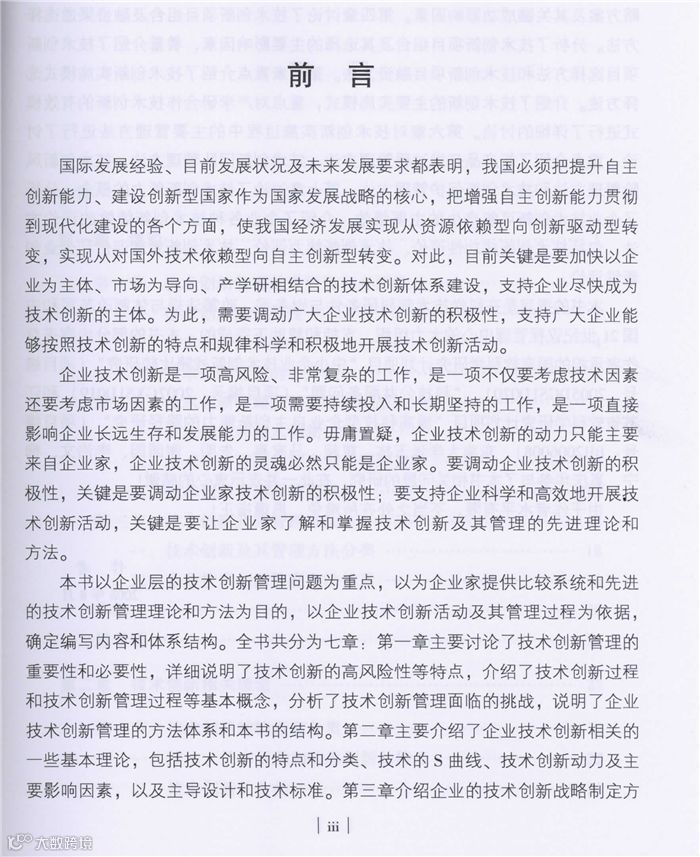 本书共分七章,包括四个方面的内容:论证了技术创新管理的重要性和必要性,说明了技术创新的高风险性等特点,讨论了企业技术创新相关的基本理论;按照技术创新活动及管理过程,分别介绍了企业技术创新战略制定方法、技术创新项目组合及融资渠道选择方法和技术创新实施模式选择方法;对技术创新实施过程中的主要管理问题,包括新产品开发过程、技术创新团队、技术创新风险等的管理方法进行了讨论;分析了企业技术创新可能产生的主要绩效。介绍了技术创新绩效的主要评价方法。