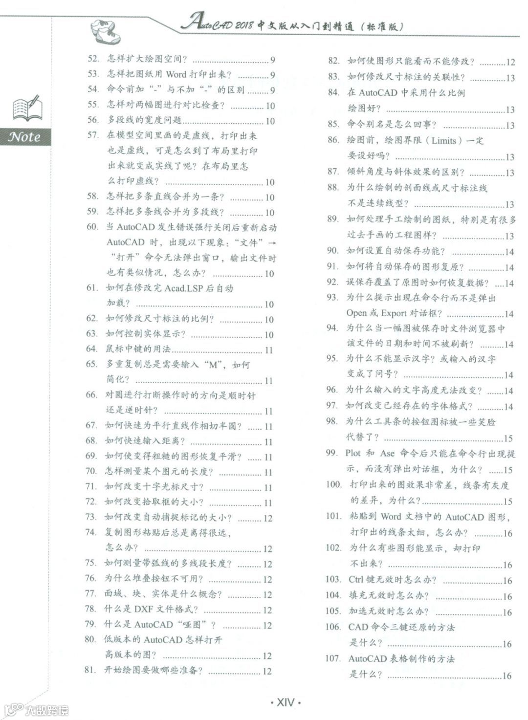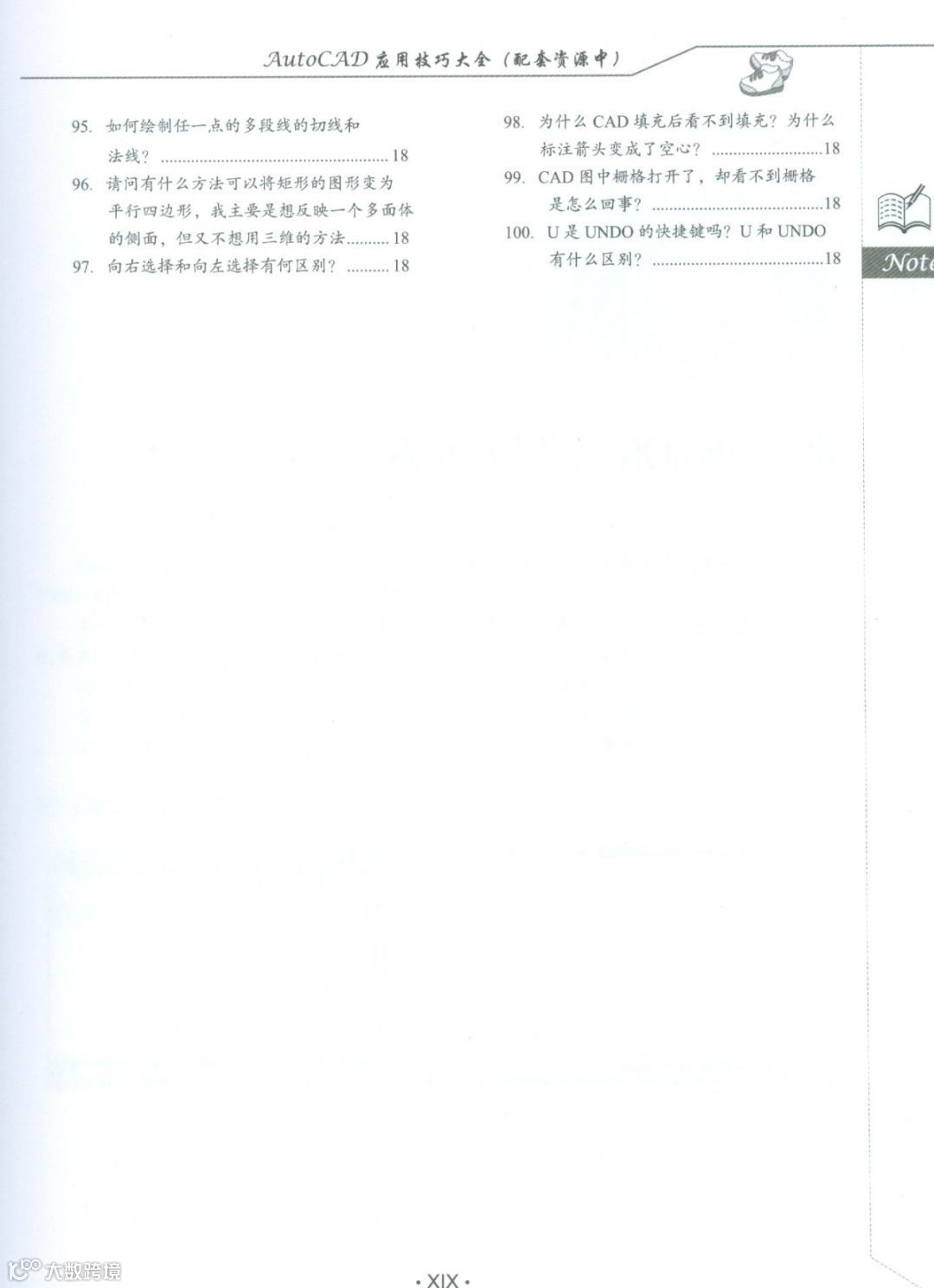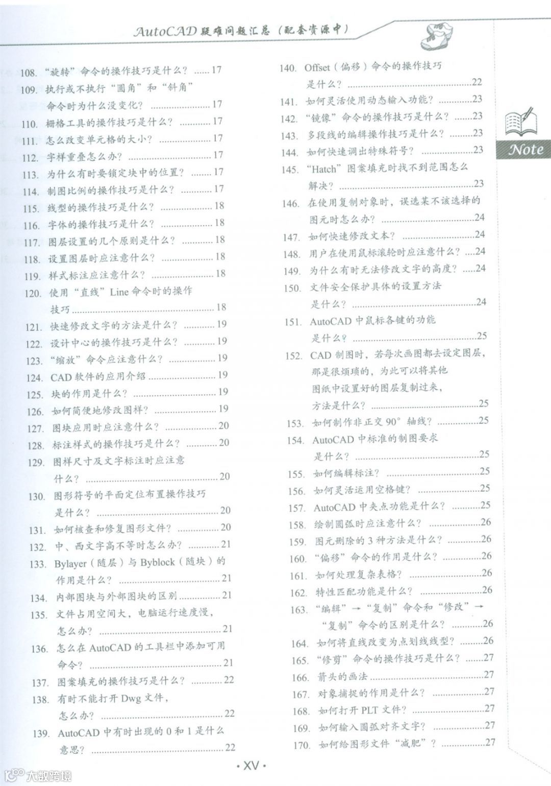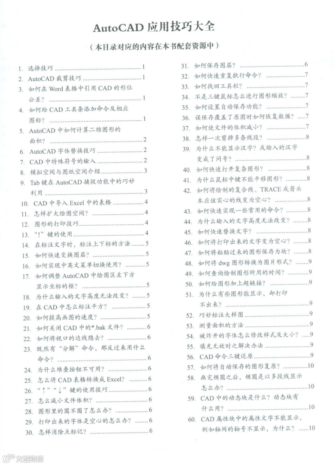 2.AutoCAD 应用技巧大全,疑难问题汇总,经典练习题、常用图块集,快捷命令速查手册,快速键速查手册,常用工具按钮速查手册等,能极大的方便学习,提高学习和工作效率。