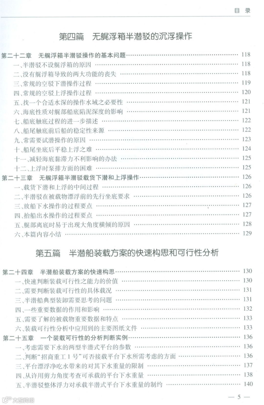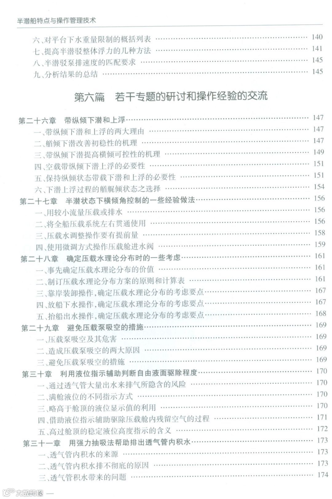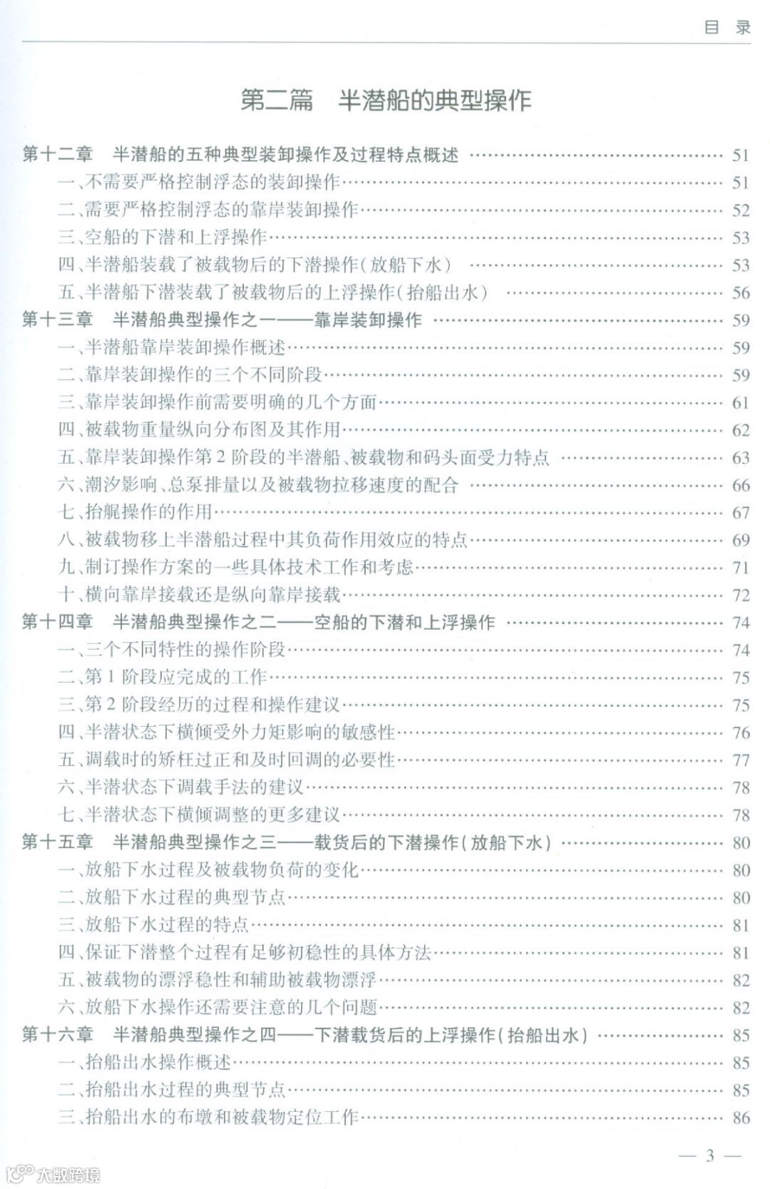 《半潜船特点与操作管理技术》一共分为六篇。第一篇半潜船和半潜驳的特点及其固有的系统。本篇共11章。第二篇半潜船的典型操作。本篇共5章。第三篇完成半潜船装卸操作的一些重要技术工作。本篇共5章。第四篇无艉浮箱半潜驳的沉浮操作。本篇2章。第五篇半潜船装载方案的快速构思和可行性分析。本篇共2章。第六篇:若干专题的研讨和操作经验的交流。本篇21章。本书旨在集中讨论半潜船的典型操作问题。要全面理解一个具体问题,读者就可能需要参考书中不同章节的内容。