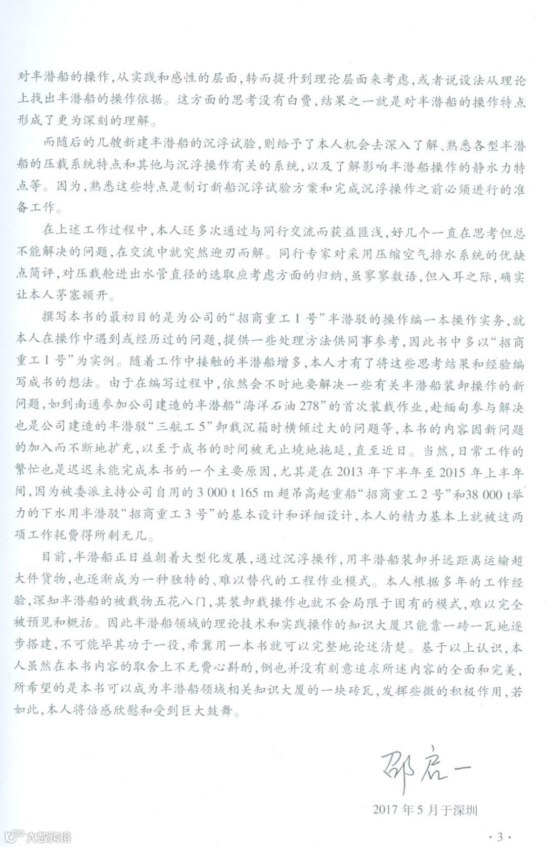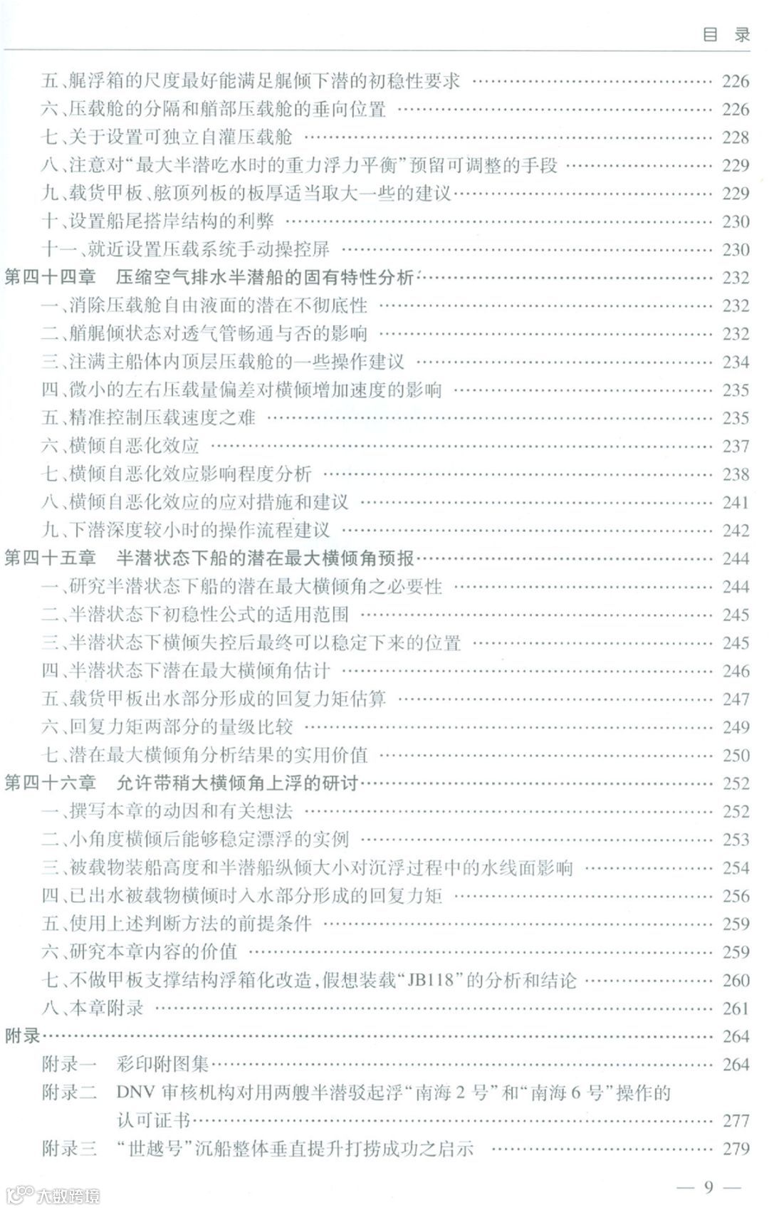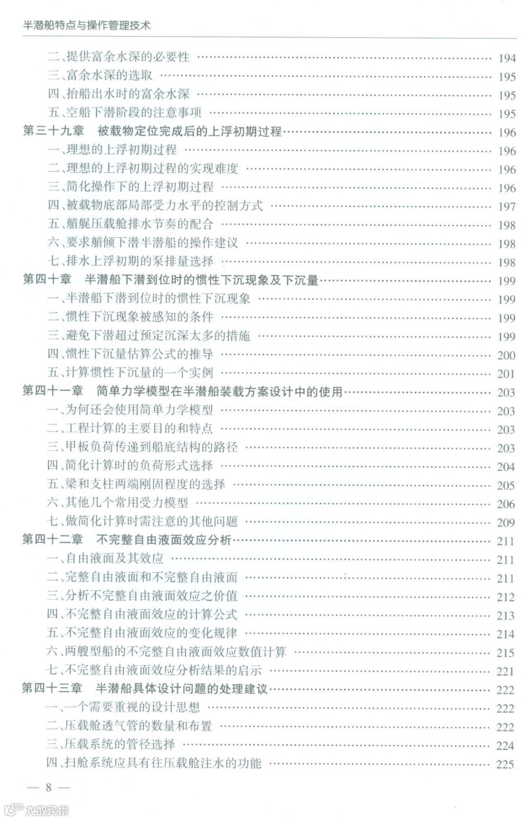 《半潜船特点与操作管理技术》一共分为六篇。第一篇半潜船和半潜驳的特点及其固有的系统。本篇共11章。第二篇半潜船的典型操作。本篇共5章。第三篇完成半潜船装卸操作的一些重要技术工作。本篇共5章。第四篇无艉浮箱半潜驳的沉浮操作。本篇2章。第五篇半潜船装载方案的快速构思和可行性分析。本篇共2章。第六篇:若干专题的研讨和操作经验的交流。本篇21章。本书旨在集中讨论半潜船的典型操作问题。要全面理解一个具体问题,读者就可能需要参考书中不同章节的内容。