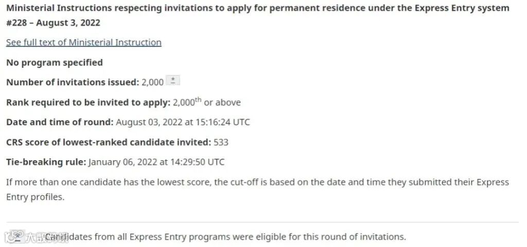 8月3日,加拿大联邦EE快速通道不区分抽选类别,向快速通道候选人发出了2000份邀请,抽选分533分。
