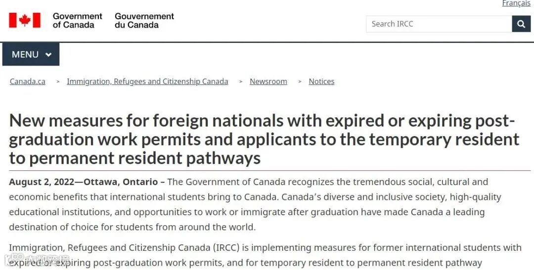 IRCC正式宣布:凡是毕业工签在2021年9月20日至2022年12月31日期间过期或即将过期的留学生,都将获得18个月的工签延期。
