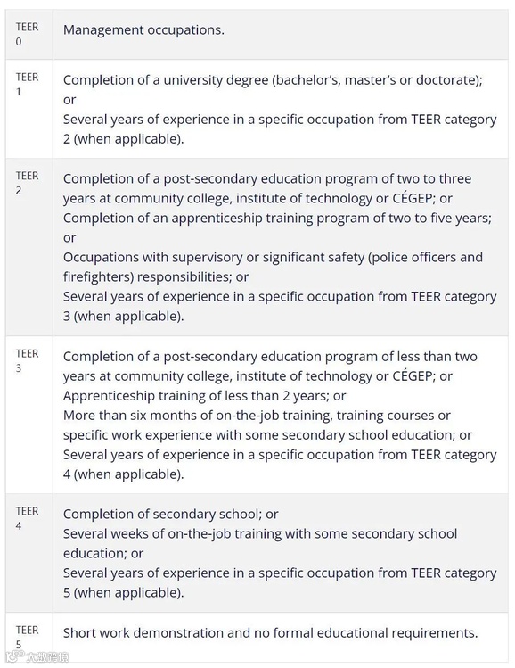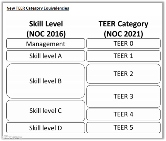 “NOC 2021”将目前的“四类技能等级”的NOC结构修改,更新为“六类技能等级”的系统,名为TEER。同时,最新的“NOC 2021”还明确了每个职业所需的培训、教育、经验等要求。