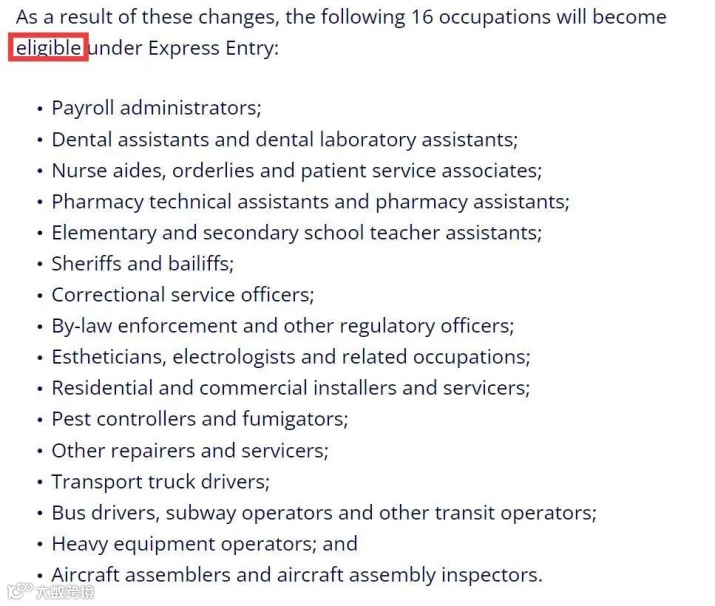 2022年11月16日,加拿大移民、难民和公民事务部(IRCC)将启用2021年版本的国家职业分类(NOC)系统,又称为NOC 2021。共有16个新职业将有资格获得Express Entry(EE,快速通道)邀请, 3个职业将不符合资格。