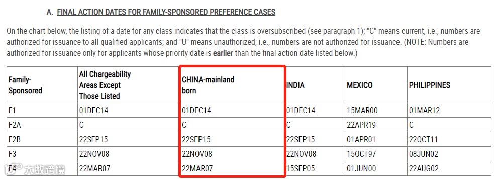 据亲属移民排期表A,对于中国大陆出生的申请人来说:
