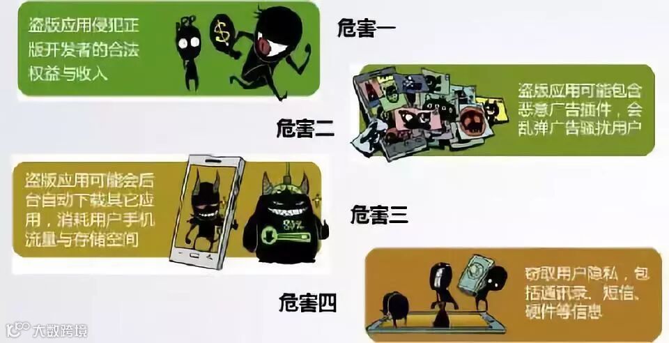 对于手机用户而言,安装盗版软件或来历不明软件后,其后果,轻则使手机在不知不觉中安装了过多的程序,导致消耗电量、占用内存资源、运行不畅、容易死机。严重的,会在不知情的前提下产生上网流量、短信计费和增值服务定制等费用,更为严重的是,盗版软件还可能通过非法上传用户个人身份、网银等信息,给用户的财产带来损失。