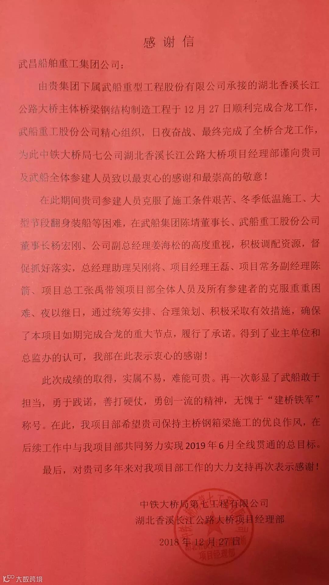 合龙仪式上,香溪长江大桥业主、总包单位对公司在大桥建设过程中表现的守信担当、硬朗作风的工作作风表示高度赞扬,并向武船集团发来感谢信,同时希望公司能继续保持优良作风,提前高效地完成后续工作任务。