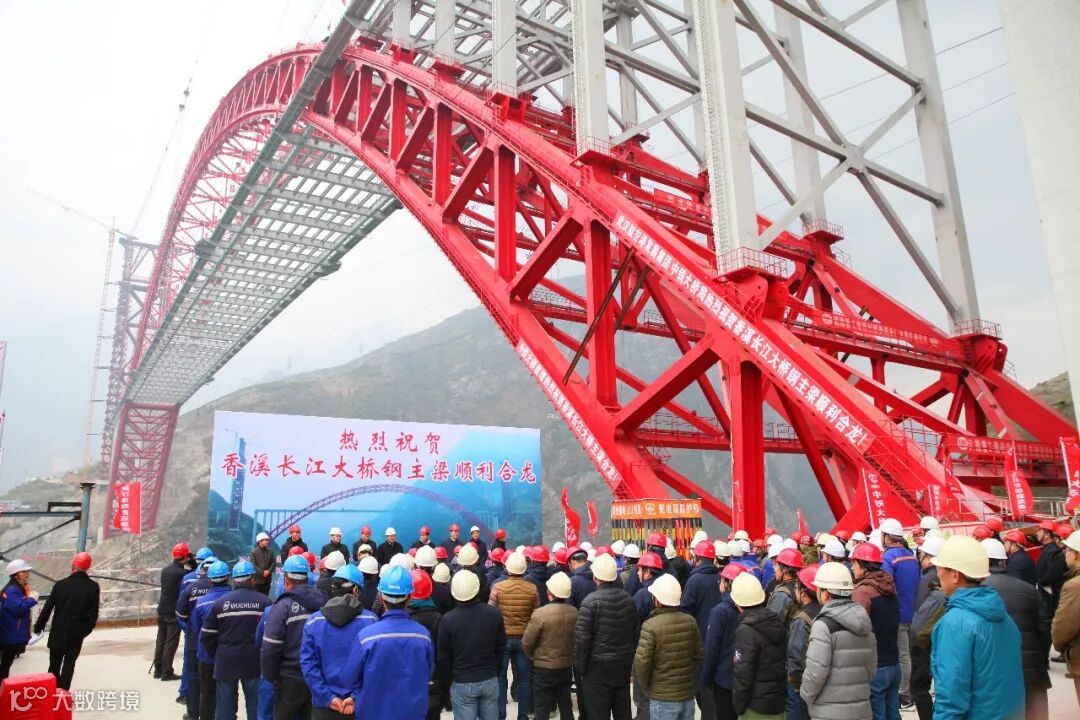 12月27日上午,随着最后一节钢主梁成功吊装就位,由武船重工股份承建的世界最大跨度钢箱桁架推力拱桥钢主梁顺利实现合龙,合龙仪式在桥址南岸举行,大桥业主、设计、总包、监理单位,武船重工股份副总经理、工会主席姜海松及公司项目部成员参加合龙仪式。