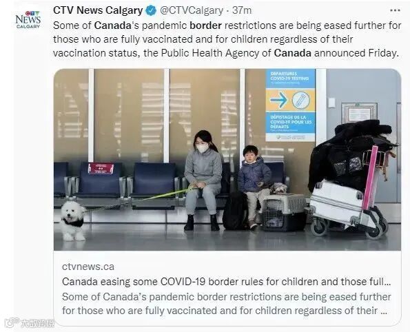 据多家英文媒体综合报道,加拿大政府今天宣布进一步放宽入境的限制,未接种新冠疫苗和部分接种疫苗的5至11岁儿童在入境加拿大时,不再需要COVID-19检测。