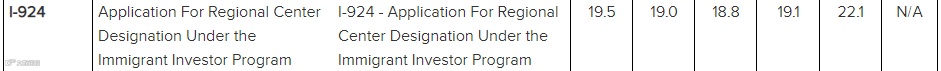 美国移民局最近也更新了一份历史统计,展示了从2017至2022年财年(截至2022年4月30日)的平均审批所需的时间(月)。下图截取了EB-5相关的I-485、I-526、I-829、I-924的平均审理时间。