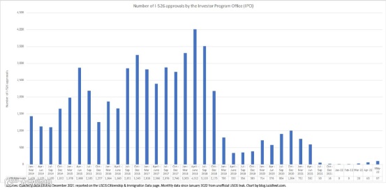 为了应对每年10000个EB-5签证配额不浪费,IPO每年至少需要批准3600个I-526(假设平均36%的EB-5签证是发给主申请人)。2022财年前8个月,IPO只批准了223个I-526。2022年5月批准了近100个I-526,而2022年2月只批准9个I-526。