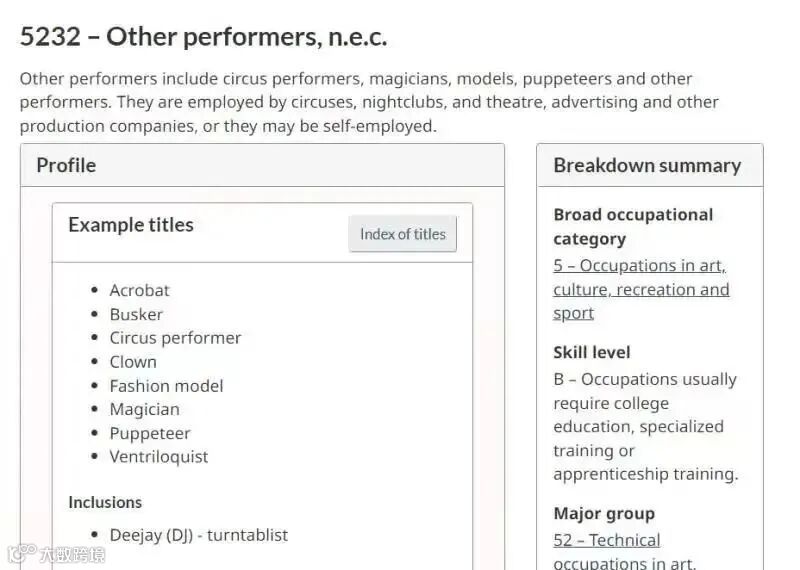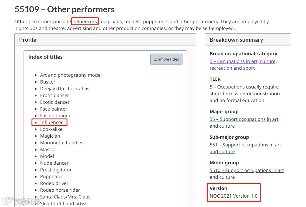 其职业代码被归类为55109(Other performers),符合加拿大移民申请要求!